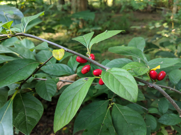 Fragrant shrub with yellow blooms and red berries, hosts spicebush swallowtail butterflies.