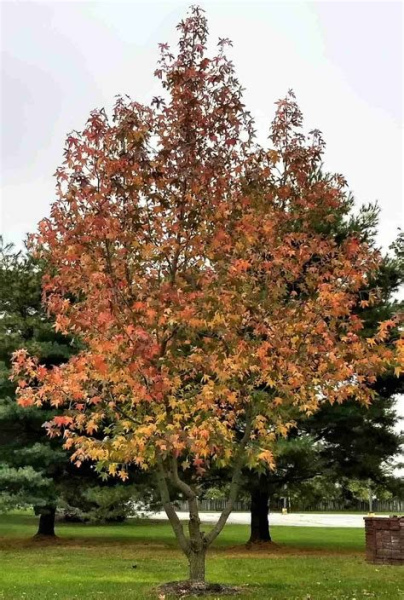 Tall tree with star-shaped leaves, vibrant fall colors, and spiky seed balls.