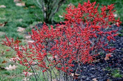 Deciduous holly with brilliant red berries lasting through winter.